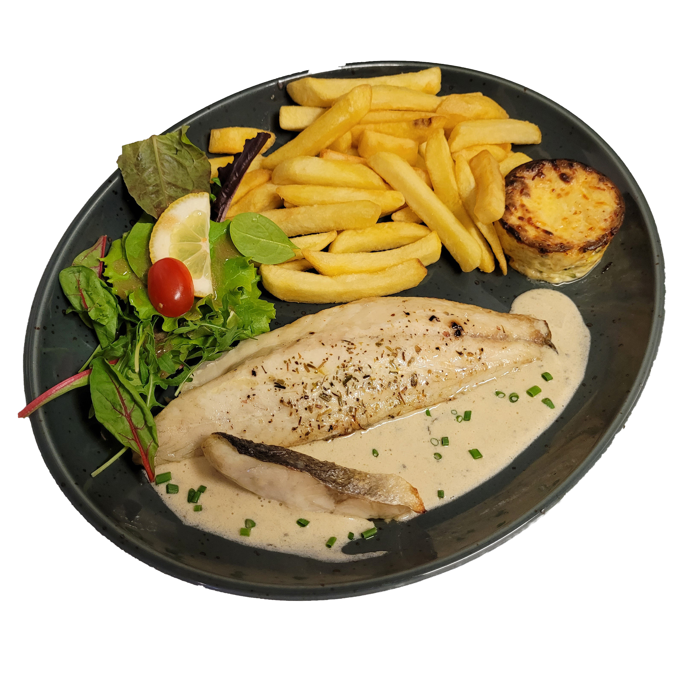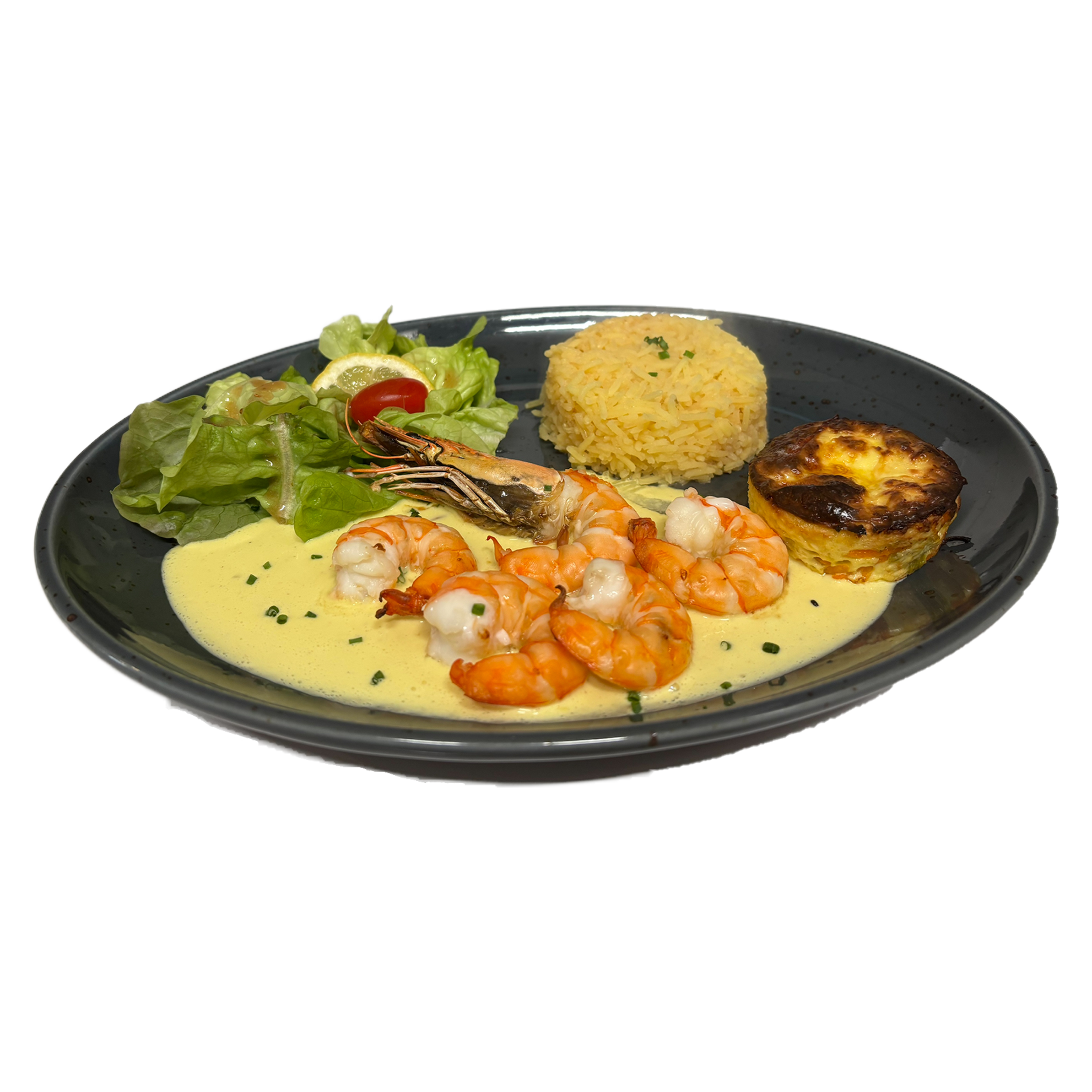Nos plats sont servis avec frites ou riz basmati et flan de légumes maison sans gluten